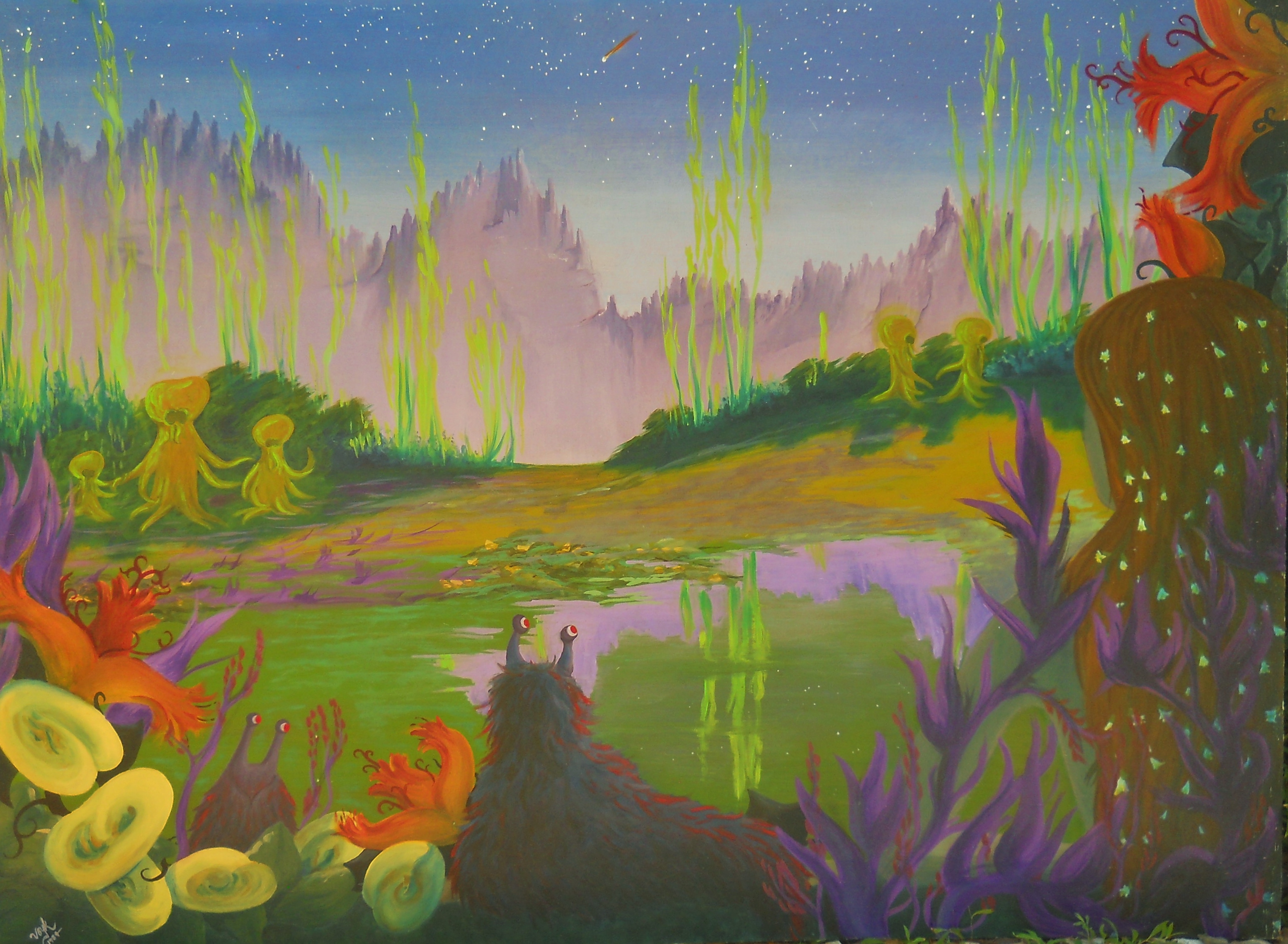 The Zoo 1984 In this piece, the protagonist is covered in flowers, she’s an exhibit in an alien zoo. She wants to escape her companions, the fuzzy slugs. But at least she’s OUTSIDE!!