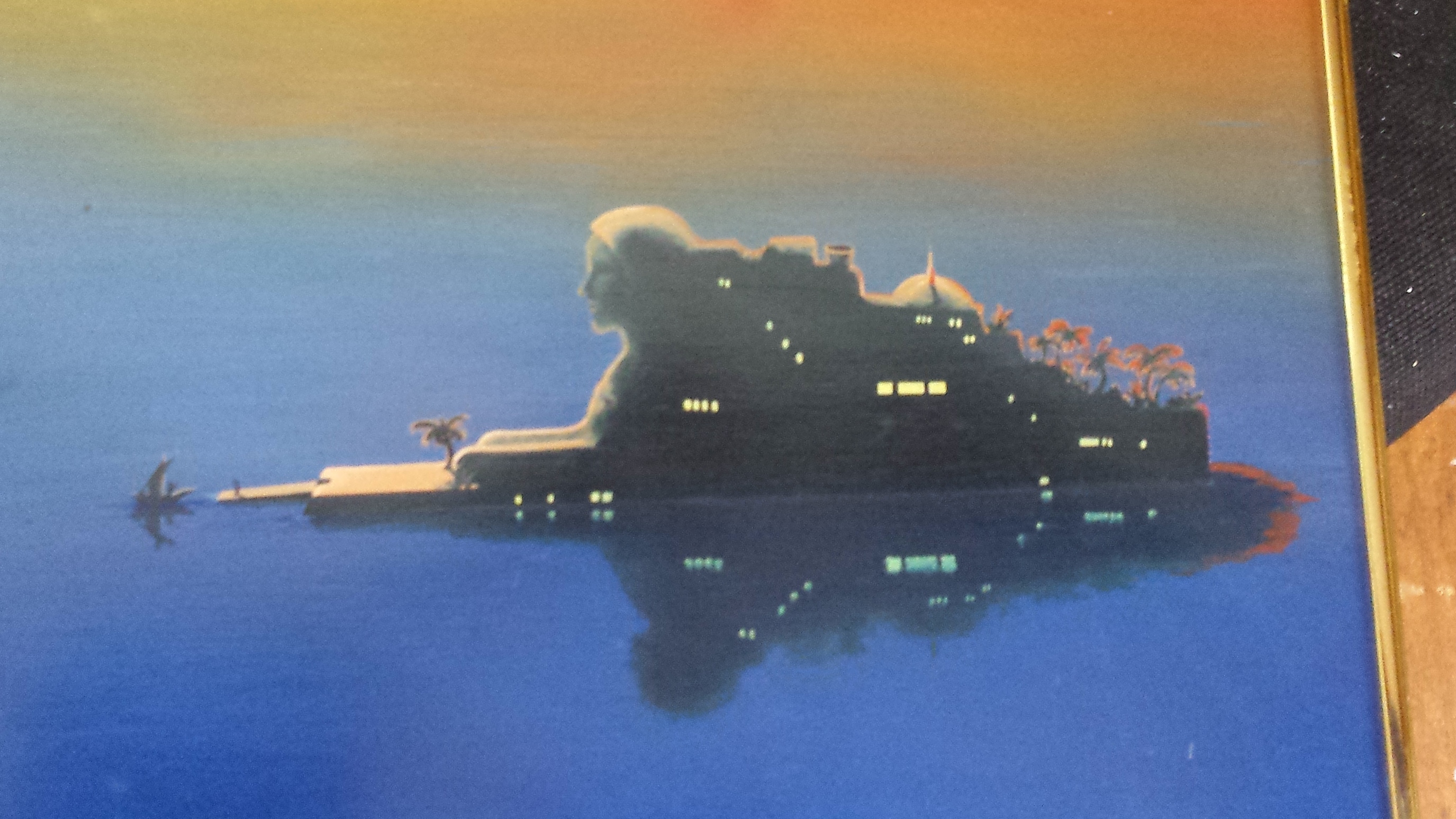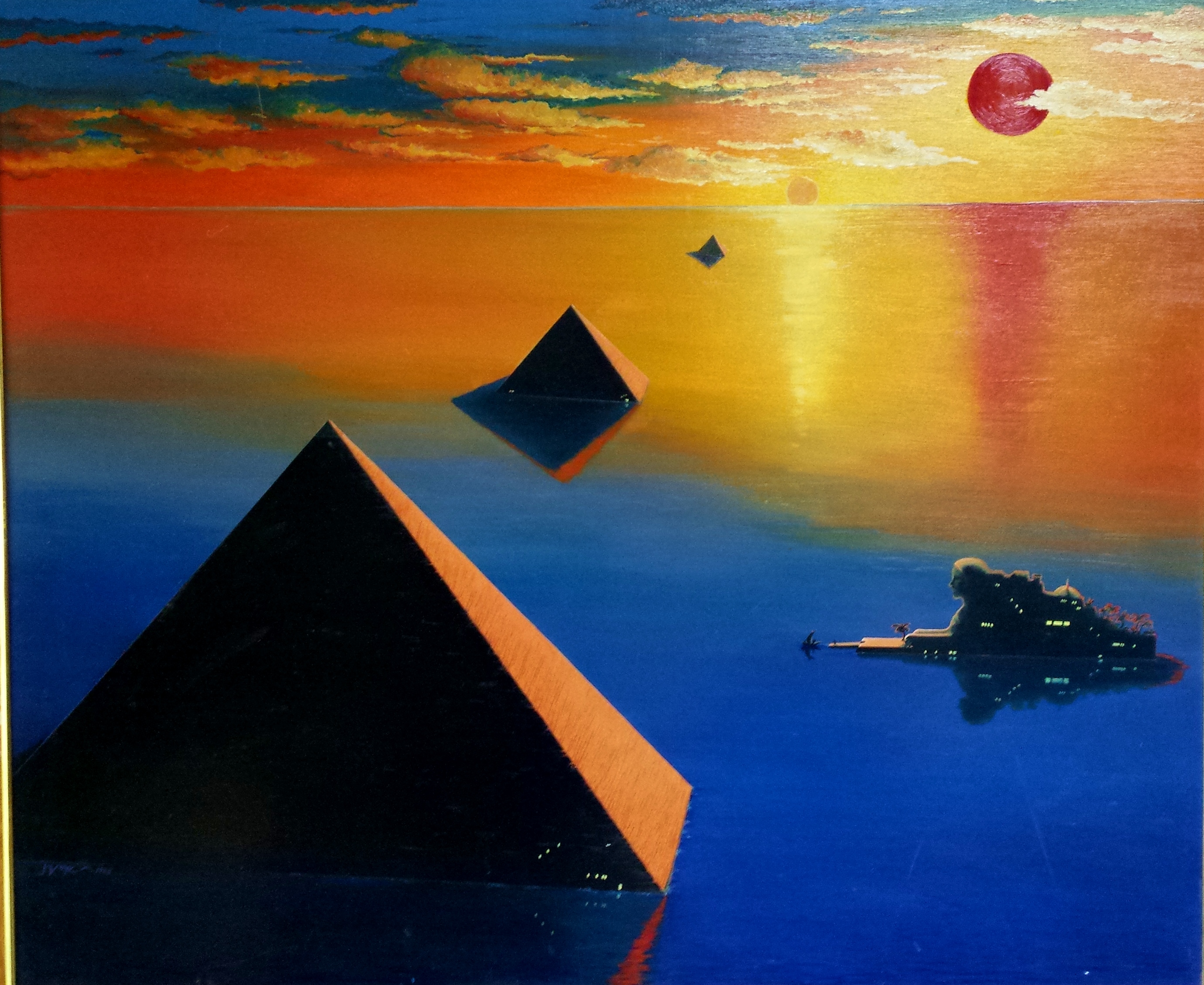 This painting that Kat loves was a direct result of my exploring days. And probably all the other paintings I did back then. I posted several a few weeks back (Dark Shadows). This painting depicts another world. A world of shallow water. It’s all they have to export and they do, to many other worlds. The pyramids they build are beacons, and docking ports for ships that travel the cosmos. Think of it as an interplanetary airport, and I’ve illustrated the “tower”.