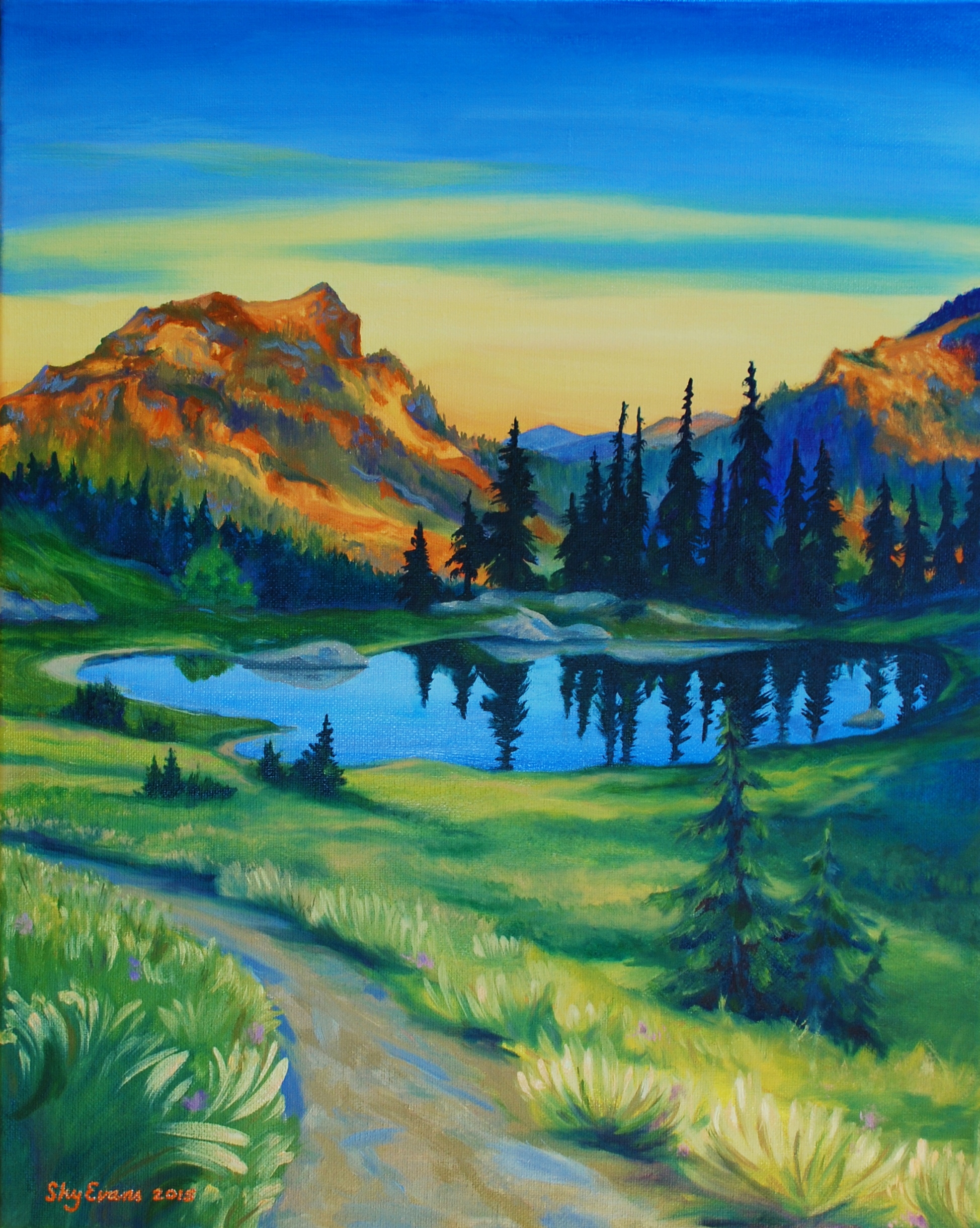 I waited two days to go back into the studio. I just couldn’t bear to look at it. I had never scrubbed out a canvas before, it felt like a failure. But two days later, I was ready to get back to work. I followed the faint leftovers of pencil lines that were under the first orange outline and redrew the sketch. Instead of the high resolution image, I went back to my original Facebook clipping. That picture, I altered to be bolder, more saturated in color than the photograph Judy had taken. I made it small and took off my glasses to blur the details. I needed to see blocks of colors, not every single rock and tree. I put on a favorite CD and lost myself in Spectacle Lake.