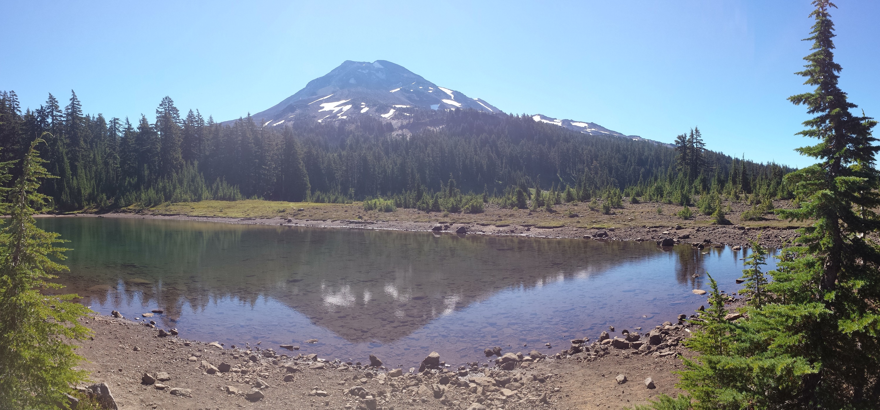 I wonder what marvelous things will happen today?  I am amazed at this part of the PCT, I’m on new ground, and it’s simply wonderful!  There are great views, nice campsites and a neat unnamed lake that had me very tempted for an early stop.  Alas, the surface was buzzing with mosquitoes so I go on by after taking a few pictures.  I run my battery charge down by taking too many panorama shots, a phenomena I suddenly notice for the first time. No wonder my phone was so inconsistent with holding a charge.