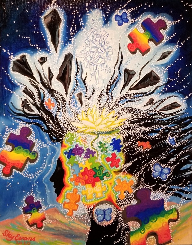 I was surprised that he used the word fragmented, as that was exactly what I’d been looking for in my past experiences, fragments of my soul I’d left behind when events happened. I used a few therapy sessions to guide me, but as an experienced meditator, once I knew the path backwards and how to retrieve these fragments, I went looking on my own. I’d journal about what I’d find and what each part brought back to me. It has been, as he said, uplifting, freeing and I do feel a more alive. Writing wasn’t enough for me, so I painted the process, once again pulling from my current experience the fuel to run my creative engine. I used my art as a way to heal and to manifest my new reality… a soul in progress, coming together. Each time I look, I find something, another fragment that returns like a piece of a puzzle. As they come home and click into place, the image of myself becomes clearer. I wonder, once all the puzzle pieces join up, what is it I will see? A new me, stronger, freer, more alive than ever.