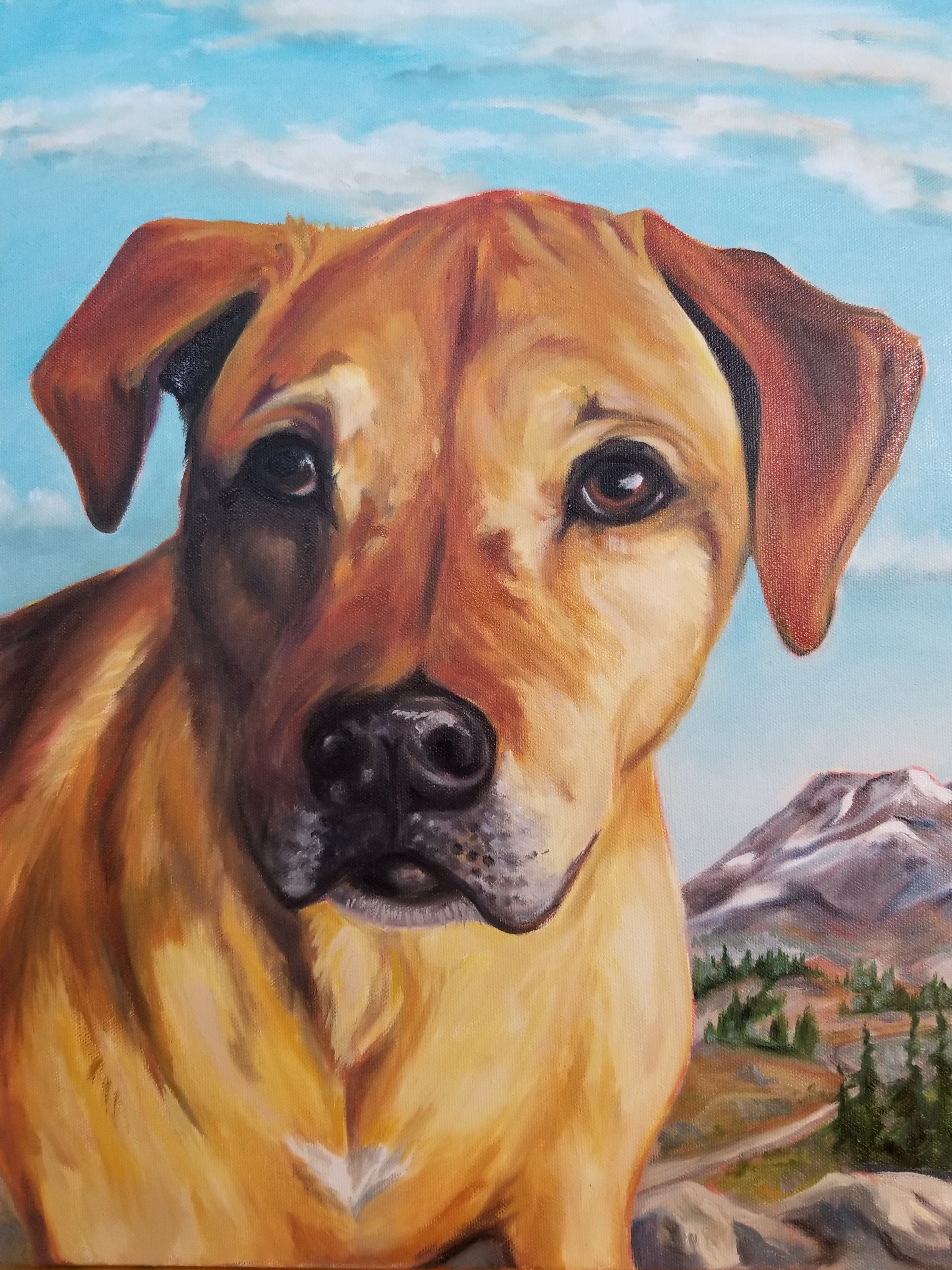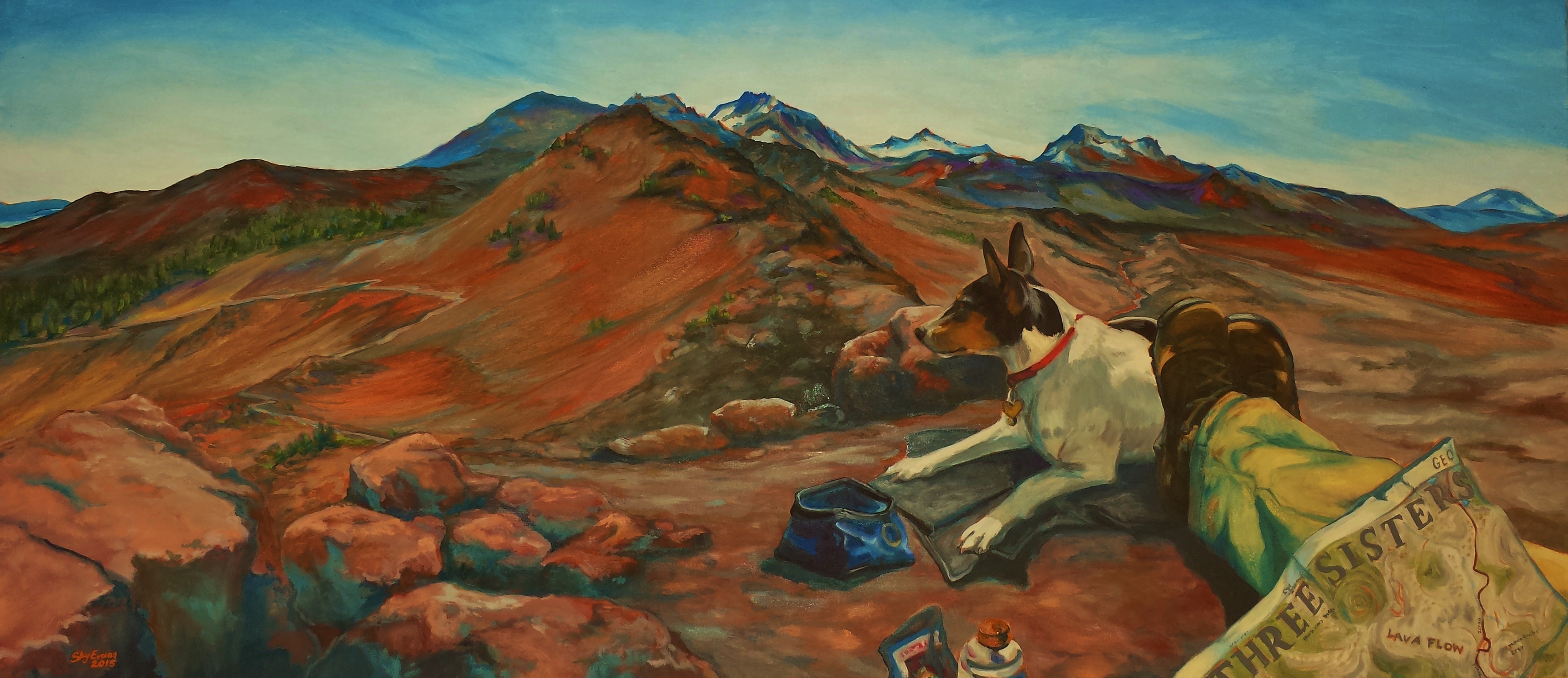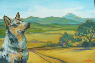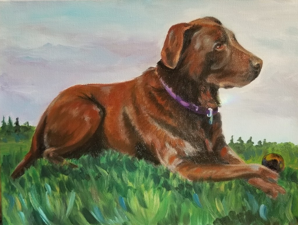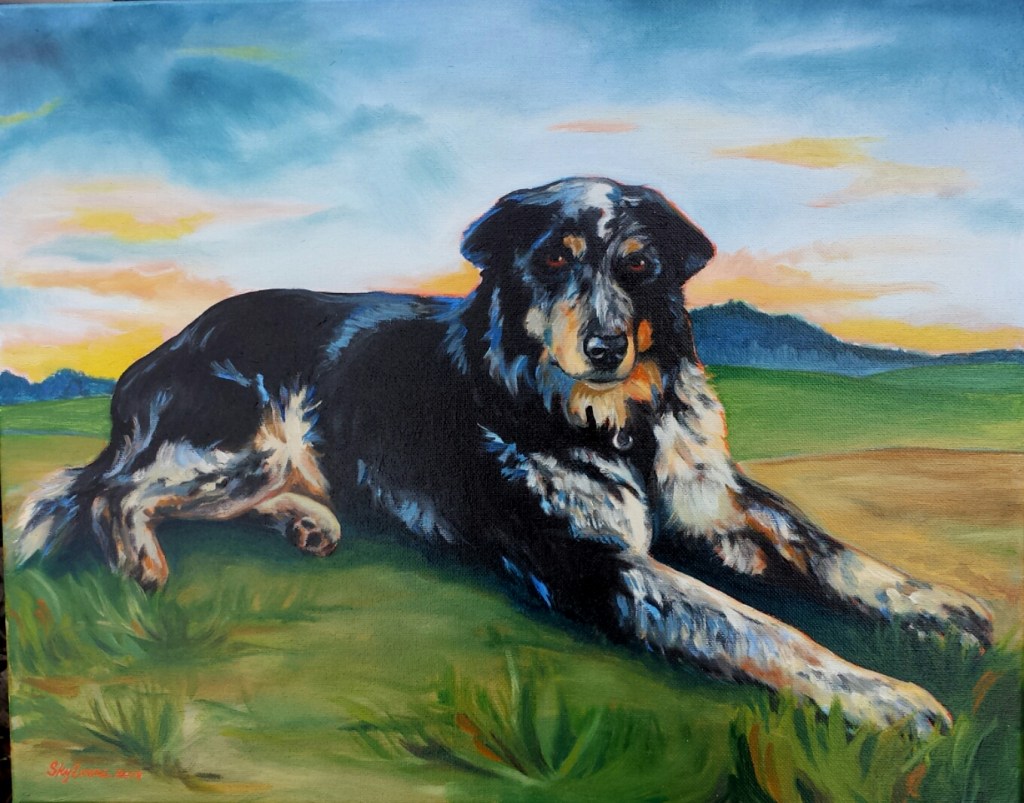 An unnamed painting donated to a fundraiser for our local library, it was purchased by a neighbor, Lisa. Hence the name! Lisa’s dog is a handsome blue heeler awaiting command.