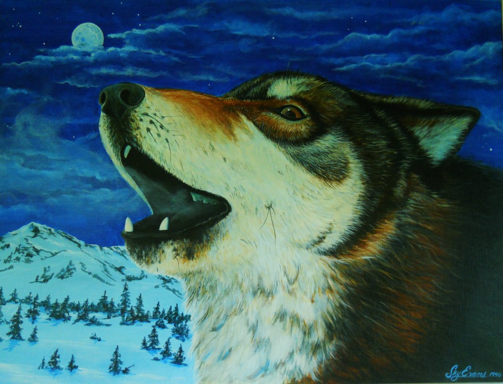 The only acrylic among the sea of oil paintings, the wolf painting still is a top seller of prints , cards and stickers. Everyone loves it… what’s not to like? Awwwwoooo!!