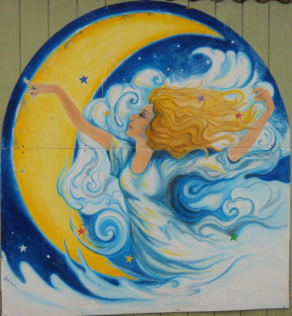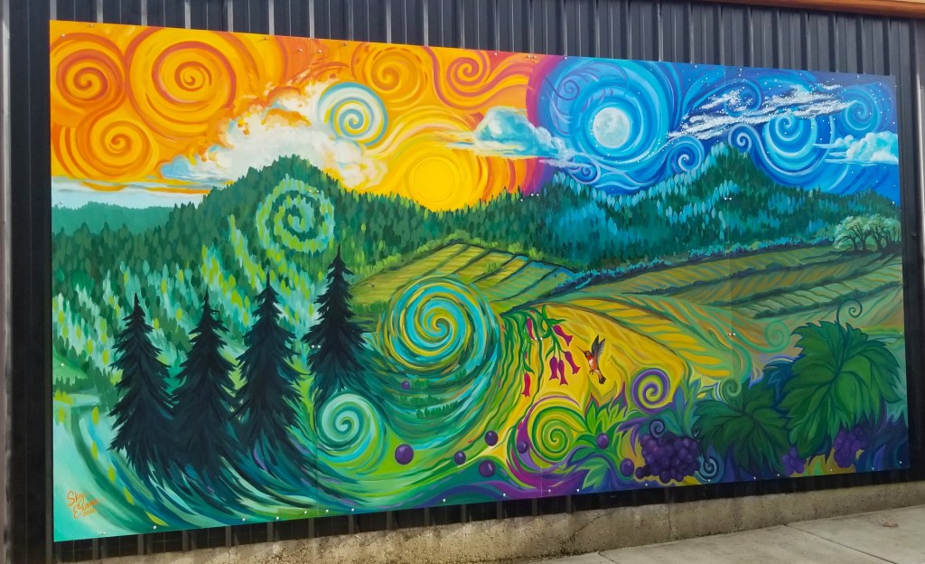 4′ x 6′ on masonite sign board. (This was actually stolen from the face of the Alpine Market in Alpine, OR but was silently returned a month later when the theives realized they could never display it without reprecussions. )